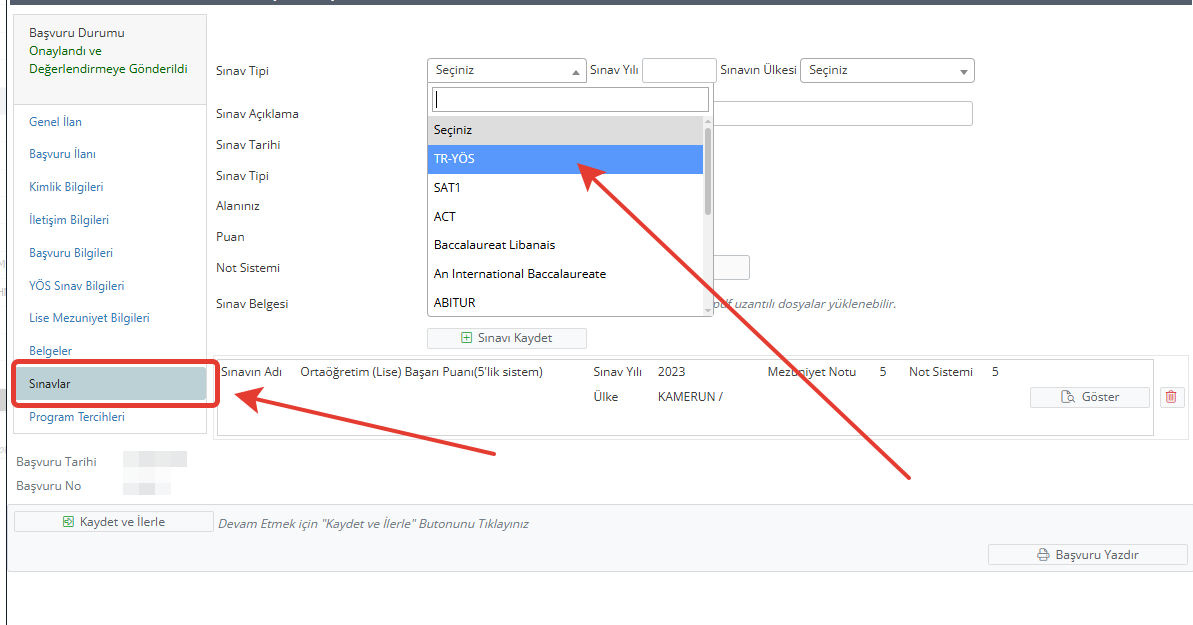 ÖNEMLİ NOT: TRYÖS İLE BAŞVURU YAPACAK OLAN ADAYLAR AŞAĞIDA GÖSTERİLDİĞİ ŞEKİLDE SINAVLAR MENÜSÜNDEN TRYÖS SINAVINI EKLEMELERİ GEREKMEKTEDİR: